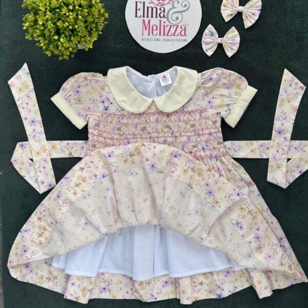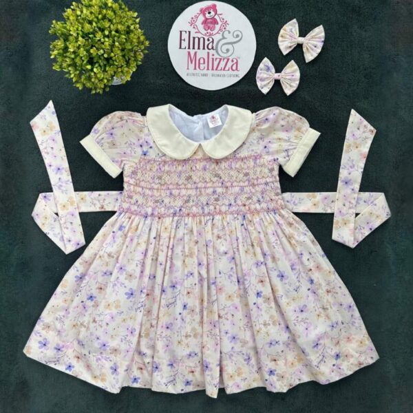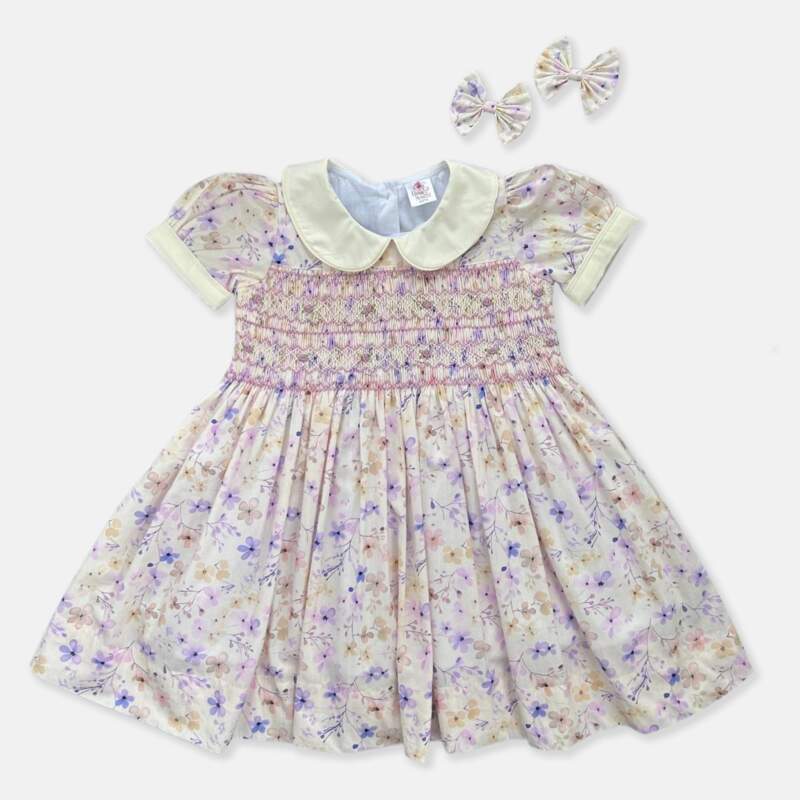 Cream and purple Floral Hand Smocked Baby Girl Dress With Matching Hair Clips / Hair Band