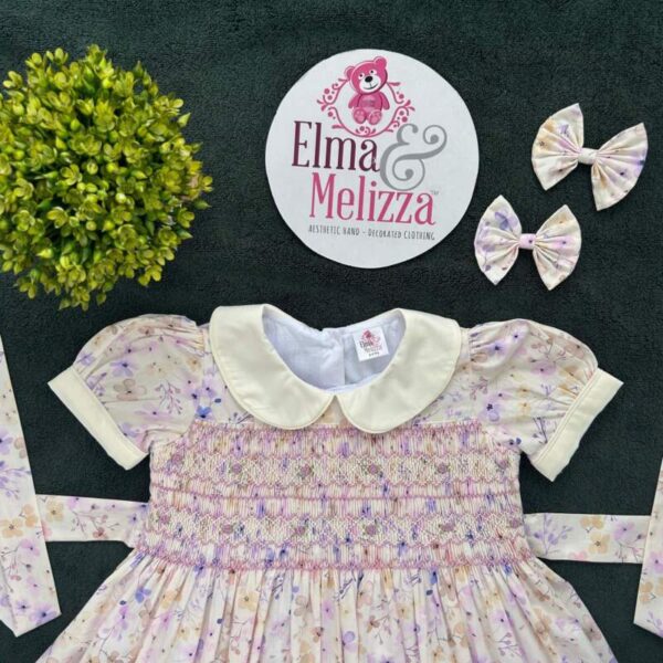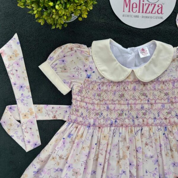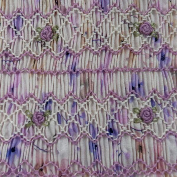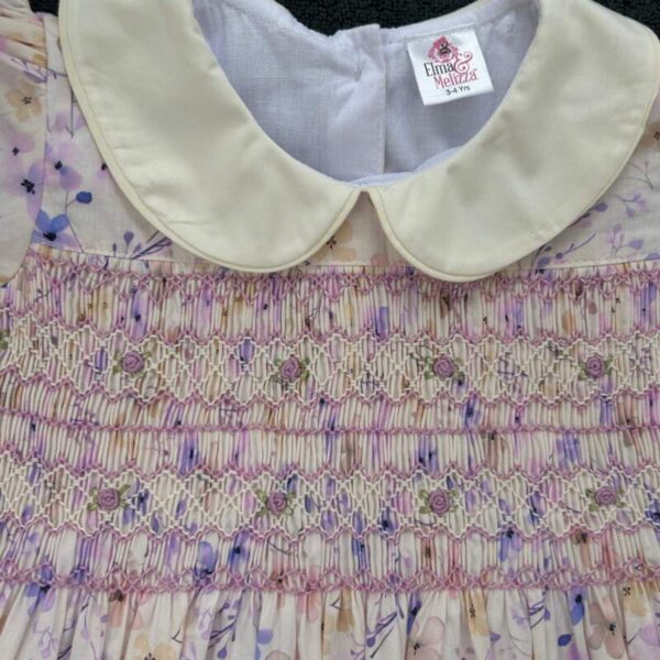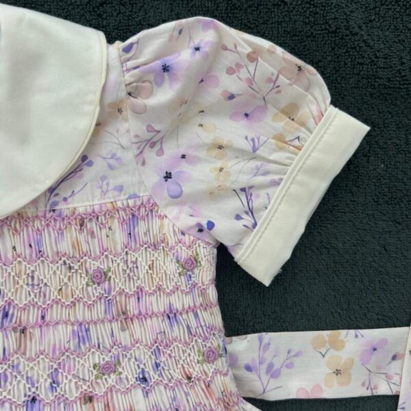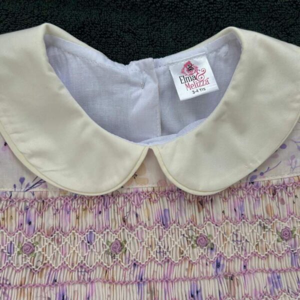 • Design Features: Hand-smocked and hand-embroidered.Elegantly designed with a Peter Pan collar and puffed sleeves. Charm, simple purple and cream colour embroidery design.