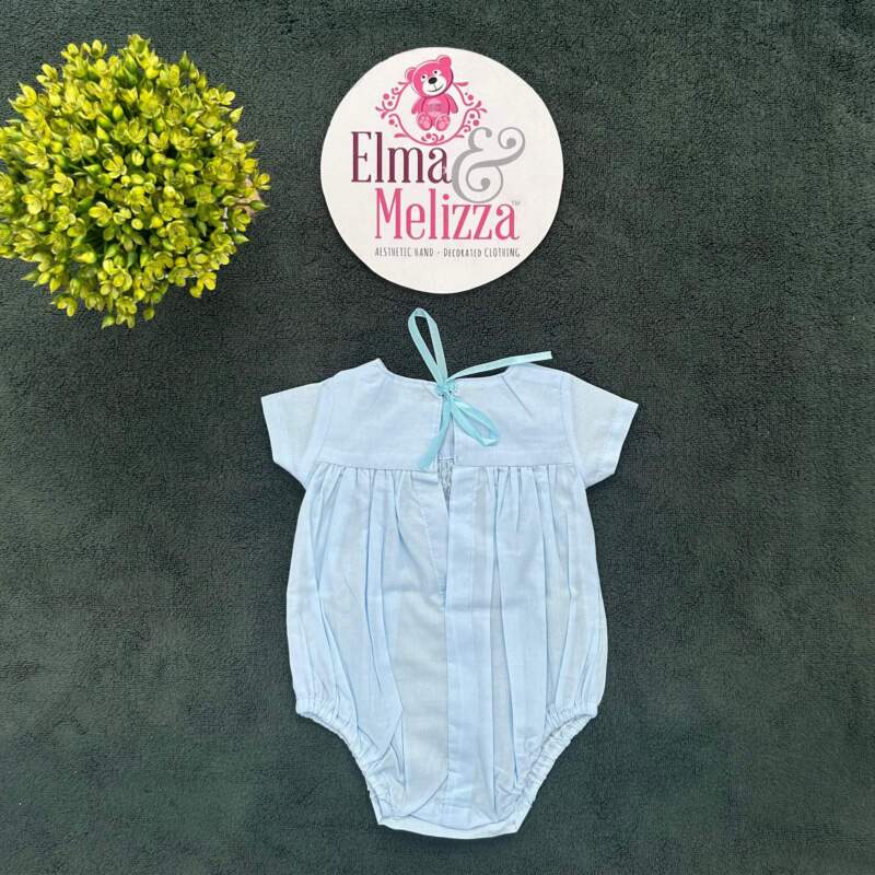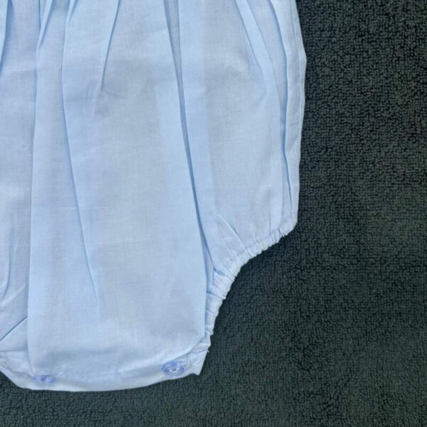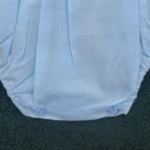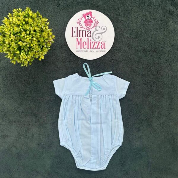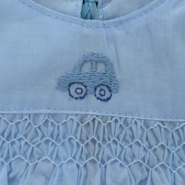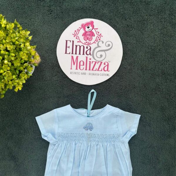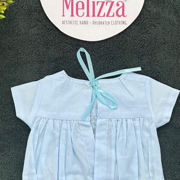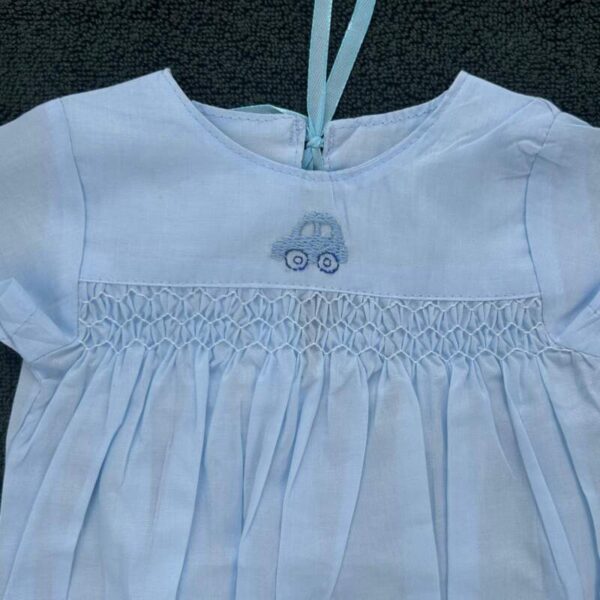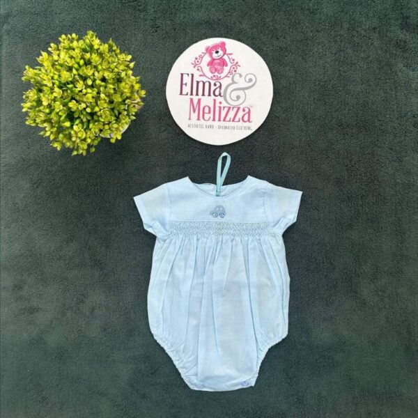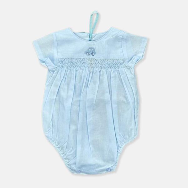 • Design Features: Hand-smocked and hand-embroidered.Elegantly designed with simple sleeves. Charm, featuring a blue embroidery design with a Snap Leg Closure.